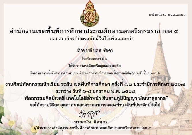 ได้รับรางวัลเหรียญทอง กิจกรรม คัดลายมือสื่อภาษาไทย ป.4-ป.6
