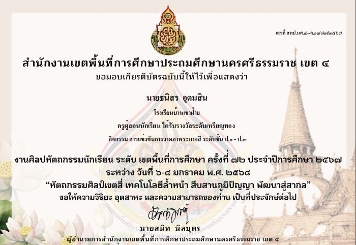ชื่อผลงาน : ครูผู้ฝึกสอน ได้รับรางวัลระดับเหรียญทอง กิจกรรม การแข่งขันการวาดภาพระบายสี ระดับชั้น ป.1-ป.3