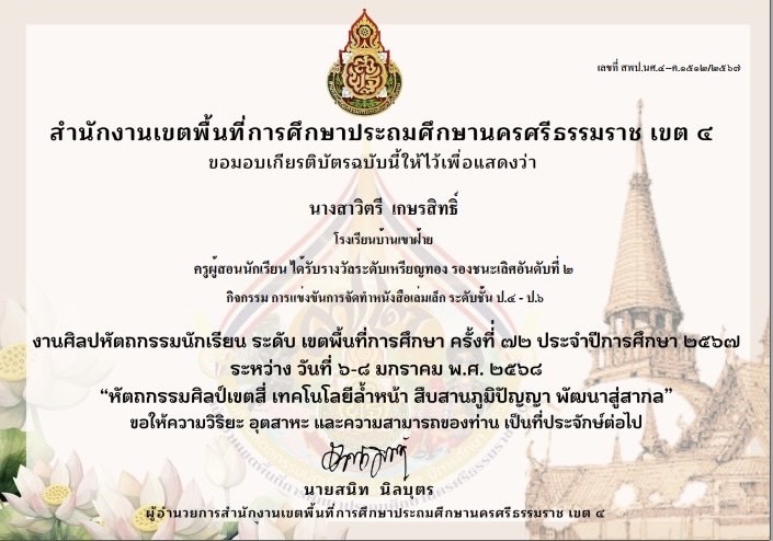 ชื่อผลงาน : ครูผู้ฝึกสอน ได้รับรางวัลเหรียญทอง รองชนะเลิศอันดับ 2 กิจกรรม การแข่งขันการจัดทำหนังสือเล่มเล็ก ป.4-ป.6