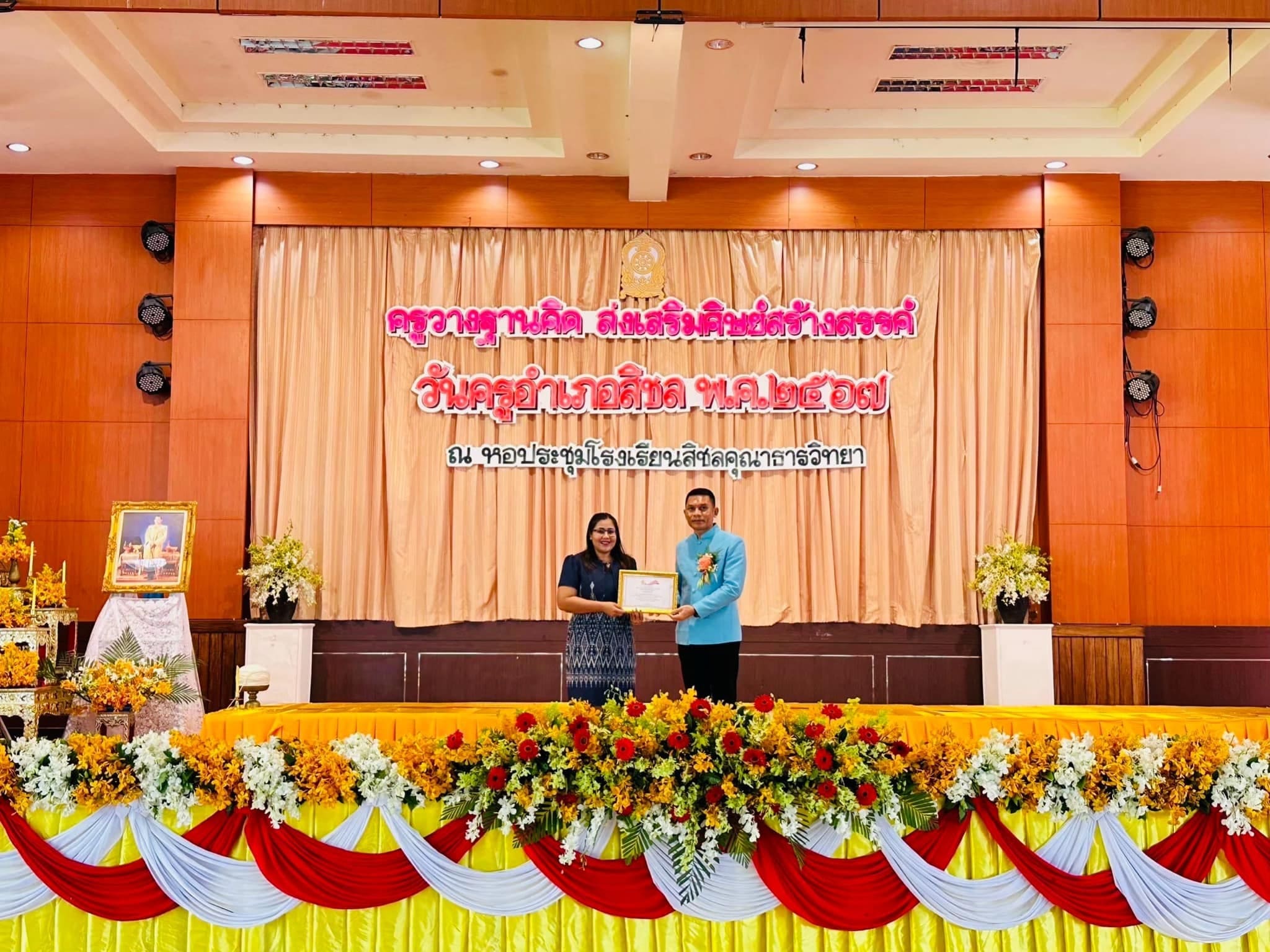 รับรางวัล นวัตกรรมสร้างสรรค์คนดี ประเภทครูผู้สอน ชื่อผลงาน จิตอาสาบ้านเขาฝ้ายสวยงามสะอาดตา