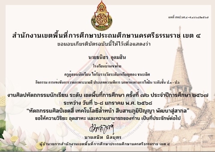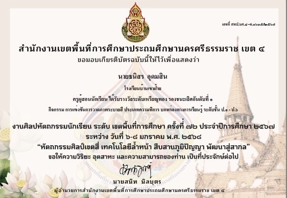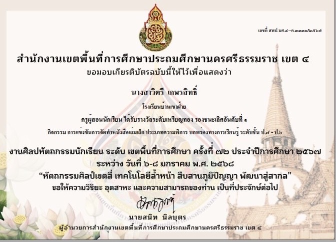 ครูผู้ฝึกสอน ได้รับรางวัลเหรียญทอง รองชนะเลิศอันดับ 1 กิจกรรม การแข่งขันการจัดทำหนังสือเล่มเล็ก ประเภทความพิการ บกพร่องทางการเรียนรู้ ป.4-ป.6 |